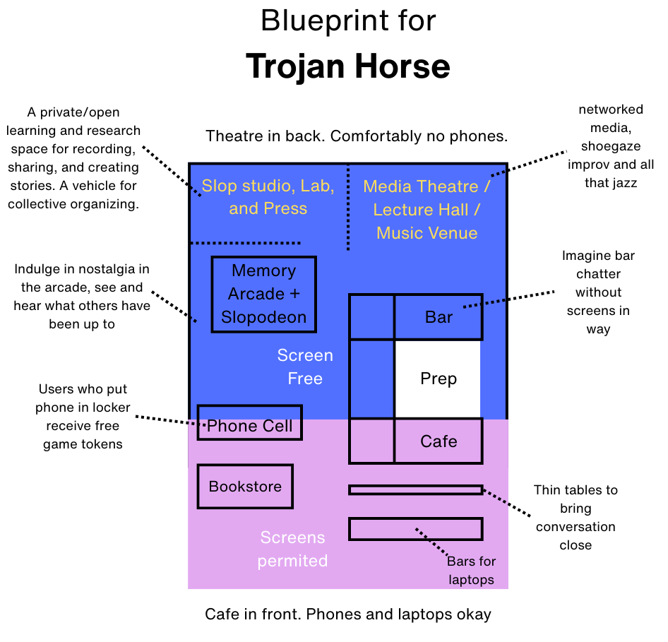 Below is a blueprint for the Trojan Horse: a café, arcade, movie theatre, and story studio designed to satisfy our modern and ancient desires for connection, entertainment, and knowledge — a scene never seen before. The design presented here considers how patrons use technology while in the space, and how technology can hinder or facilitate face-to-face conversation. The design is not preachy or cop-like about letting people use their screens, but it doesn’t allow screens to dominate the scene.